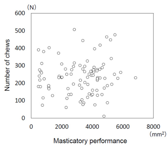 No significant correlation was found between masticatory performance (amount of increase in surface area of comminuted gummy jelly) and the number of chews when consuming a rice ball (Spearman’s correlation coefficient: r = 0.055, p = 0.600).