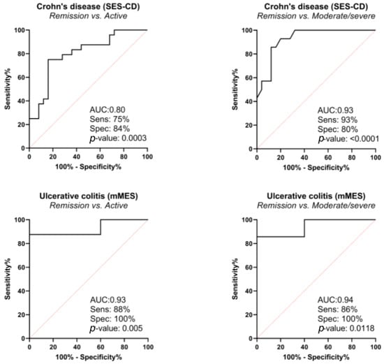 Categorical variables are expressed as percentages, and continuous variables as means with standard deviation or medians with interquartile range (25th and 75th percentiles), depending on the distribution. Differences between continuous variables were tested using the two-way T-test or analysis of variance (ANOVA), followed by Tukey post-hoc analysis for parametric analysis, and the Mann–Whitney U-test or Kruskal–Wallis test with post-hoc Mann–Whitney U-test for non-parametric analysis. The false discovery rate method (FDR 5%) was used for multiple comparison correction. Discriminative power of biomarkers among disease activity groups was assessed using the receiver operating characteristic curve (ROC curve) with the DeLong methodology and stepwise logistic regression analyses to calculate the diagnostic value of combined biomarkers. First, the ROC curve analysis was performed on single biomarkers to identify most relevant biomarkers. Diagnostic accuracy was calculated by the following equation: Diagnostic accuracy = ([True negatives + true positives]/[true negatives + true positives + false negatives + false positives]). Statistical analyses were performed using MedCalc. Moreover, we used principal component analysis (PCA) on scaled and centered data to investigate the association of measured biomarkers with the endoscopic activity of the disease. The results are reported as a scree plot, graph of variables, and graph of individuals in Supplementary Materials (Figure S5). The analysis was conducted in R (version 3.6.0., R Development Core Team, Vienna, Austria) using the factoextra package. Statistical tests were two-tailed, and the level of statistical significance was set at 0.05.