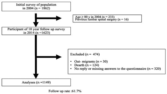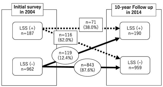 In this study, the LSS-symptoms survey was combined with annual health checkups of residents enrolled in the National Health Insurance system in Tadami town, Ina village, and Tateiwa village in Fukushima prefecture, Japan. Of the 3367 people who participated in the health checkups, 1862 (697 males, 1165 females; age range, 19–93 years) were followed up for the LSS survey, which corresponds to 21.5% [] of the 8660 people in the survey area, and 55.0% of those who participated in the health checkups. Ten-year follow-up survey was performed in 2014. In this 10-year follow-up study, a questionnaire was mailed to the subjects for them to complete. Then, a volunteer visited each subject to collect the questionnaires. Participants were excluded if they were unable to walk independently, fill out the questionnaires due to visual impairment, had ever undergone brain or spinal surgery, or had experienced a fracture of the lower extremities in the year previous to the start or the follow-up of the study period []. The 1623 people who were younger than 79 years and completely filled LSS-SSHQ in the initial survey were surveyed in this study. Of the 1623 people, 320 did not reply to the questionnaire, 154 had died or moved away. In total, 41 subjects who underwent lumbar spine surgery for 10-year follow-up periods were included as LSS-positive at follow-up. Finally, 1149 people (406 males, 743 females; age range, 30–89 years at 10-year follow-up) replied to the questionnaire, and their answers were analyzed (Figure 1). In this study, the participants voluntarily participated in the LSS survey, and the analysis was also conducted in a state in which there were no omissions in the questionnaire. The percentage of omissions was 75/1862 (4.0%) at the time of the initial survey and 320/1623 (19.7%) at the follow-up survey, which is considered to be a sufficiently reliable filling rate. Written informed consent was obtained from all subjects.