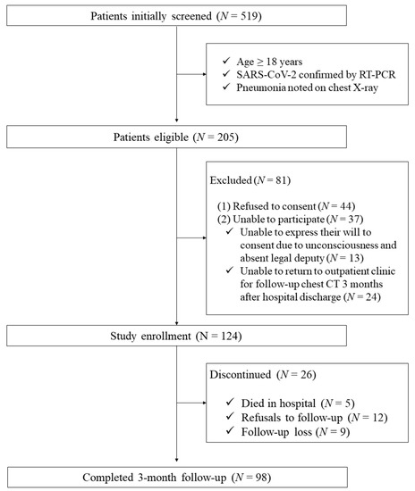 This single-center prospective study included patients who were diagnosed with COVID-19 pneumonia. The entire population of 519 patients hospitalized at the National Medical Center in the Republic of Korea from 12 April to 22 October 2021 was screened. The patient inclusion criteria were as follows: (1) age > 18 years; (2) SARS-CoV-2 infection confirmed by a positive nasopharyngeal swab reverse transcriptase-polymerase chain reaction; and (3) a diagnosis of pneumonia from an initial chest X-ray. Patients who refused to consent to this study, were unable to participate, were unable to express their will to consent due to unconsciousness and the absence of a legal deputy, or were unable to return to the outpatient clinic for a follow-up chest CT scan 3 months after the hospital discharge were excluded (Figure 1).
