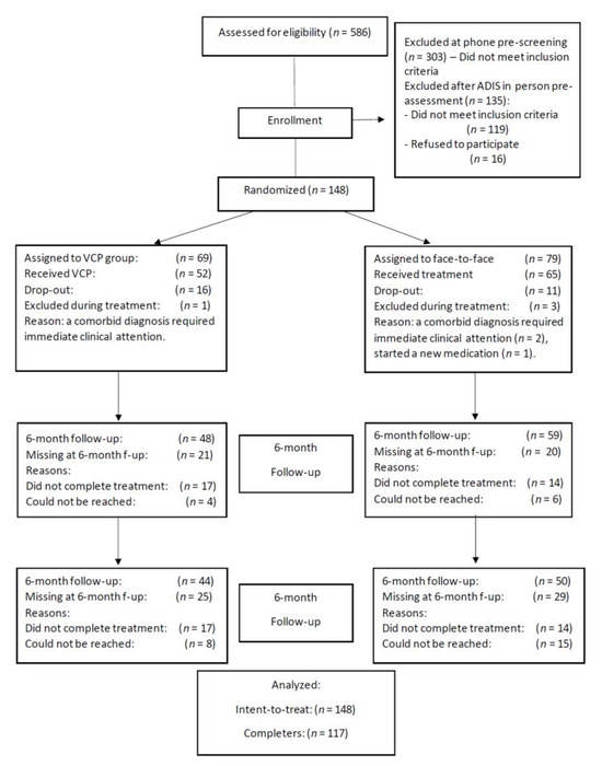 Data were analyzed using IBM SPSS version 28 (IBM Corp, Armonk, NY, USA, 2021), except for non-inferiority tests which were conducted with jamovi 2.2.5 [75] and the TOSTER module [76] for the lower or upper bound 1-sided significance tests and probability values. Non-inferiority analyses were conducted in accordance with recommendations by Mauri and D’Agostino [77] and Wellek’s [53], (p. 16, p. 30) using a strict margin of tolerance for non-inferiority of ε = 0.36 (i.e., ±10%) applied to the lower equivalence bound of the TOST equivalence test when VCP showed smaller improvements in comparison to face-to-face or applied to the higher equivalence bound of the TOST equivalence test when VCP showed larger improvements in comparison to face-to-face. The non-inferiority margin was set a priori in the grant proposal based on clinical expertise and Wellek’s [53] strict criteria of smallest acceptable difference. Missing data were handled using an intent-to-treat approach, where each missing information was replaced by the last available observation carried forward. This approach is more conservative than analyzing only treatment completers, as it protects against inflation of success rates at post-treatment and follow-ups. The non-completers rate was not statistically different in the two conditions (X2(1) = 1.06, p = 0.30). Further comparisons between completers and non-completers revealed no statistical difference on most variables (age, sex, presence or number of comorbid disorders, treatment sites, ADIS-IV, WAQ, and IUS) but significantly lower scores among the non-completers in motivation, PSQW, and measures of quality of life, as well as higher BDI-II scores. Comparisons between completer status and treatment conditions revealed no statistically significant interaction, with all effect sizes being very small (partial eta square range between 0.000 and 0.01). Although the impact of non-completers seemed limited, following recommendations by Mauri and D’Agostino [77], results of the per-protocol treatment completers is also reported for consistency of the non-inferiority tests. As an alternative for handling missing data and covariance among measures over time, Mixed Linear Modeling (MLM) analyses are reported in Appendix A. Analyses on completers are reported in the main text to rely on actual data from participants instead of data estimated by MLM models. Repeated measures ANOVAs with completers and MLM analyses will be given less attention, as their conclusions were consistent with the more conservative approach. The assumption of normality was not met for the outcome measures, which is expected in clinical samples. All analyses were also performed with non-parametric analyses, and all results of the parametric analyses were replicated; parametric analyses are therefore reported here. Mauchly’s test for sphericity was sometimes statistically significant; hence, the Greenhouse–Geisser correction to the degrees of freedom was applied to all analyses. Significance levels were set at p = 0.05 for the descriptive statistics and the main outcome measure (ADIS-IV), and family-wise Bonferroni corrected for the secondary (PSWQ, WAQ, IUS: p < 0.05/3 = 0.017) and tertiary measures (BDI-II, WHO-QOL—Psychological, WHO-QOL—Social relations: p < 0.05/3 = 0.017).