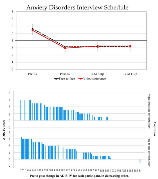 Visual representations of the results on the ADIS-IV primary outcome measure for 148 adults diagnosed with GAD who received cognitive-behavior therapy in videoconference (VCP) or face-to-face, with data aggregated by condition (line-graph, top) and pre to post change data reported for each individual (waterfall bar chart, bottom).
