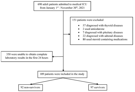 A total of 690 adult patients admitted to the medical ICU were evaluated and recruited into the study. Of these, 151 patients met the exclusion criteria and were excluded. An additional 350 patients were excluded because their laboratory investigations could not be acquired within the first 24 h of admission. Therefore, a total of 189 patients were recruited into the study. The study flow is shown in Figure 1.