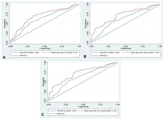 The AuROC of APACHE II scores, free T3, random cortisol and the add-on value of those hormones in combination with APACHE II scores are summarized in Table 4. Among the hormonal parameters, random cortisol had the highest AuROC (0.725, 95%CI 0.654–0.796) followed by free T3 (0.708, 95%CI 0.632–0.782). The APACHE II scores showed the lowest AuROC (0.656, 95%CI 0.579–0.734). The added value model of random cortisol and APACHE II scores had a significantly higher AuROC compared with the APACHE II model alone (AuROC 0.728 versus 0.656, p = 0.010), but there was no observed significant difference in the free T3 added value model (AuROC 0.707 versus 0.656, p = 0.280). If serum random cortisol and free T3 were added to the APACHE II model, a significantly higher AuROC than in the APACHE II model alone was demonstrated (AuROC 0.728 versus 0.656, p = 0.009). The figures of AuROC are as shown in Figure 2.