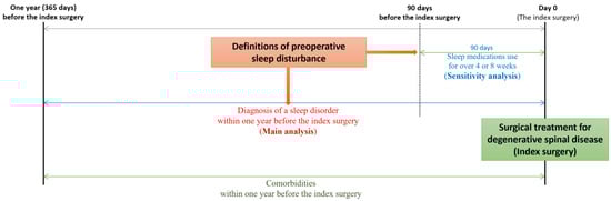 Sleep disturbance in the cohort was identified using the following two methods (Figure 2). First, sleep disturbance was primarily defined as a diagnosis of sleep disorder within one year before the index surgery. Preoperative sleep disorder was identified using the following diagnostic codes: Nonorganic sleep disorders (F51), and sleep disorders (G47). This was then used as the target outcome in the main analysis. Second, in the sensitivity analysis performed to internally validate our results, sleep disturbance was additionally defined by the use of sleep medication during the 90 days before the index surgery. Sleep medication was defined as drugs currently available for insomnia approved by the Korean Food and Drug Administration, including flurazepam, triazolam, flunitrazepam, brotizolam, zolpidem, eszopiclone, doxepin, doxylamine, and diphenhydramine []. Among them, antihistamines, including doxylamine and diphenhydramine, were excluded. The ATC and HIRA general name codes for sleep medication are presented in Supplementary Table S1. Data regarding preoperative sleep medication were used as the target outcome in the sensitivity analysis.