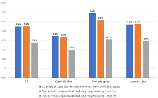 The prevalence of sleep disorders was 6.9%, 5.7%, and 4.4% in patients with thoracic, lumbar, and cervical spinal lesions, respectively (Figure 3). Prevalence rates of sleep disturbance defined by the use of sleep medication were also concordant with the proportions of those who were diagnosed with a sleep disorder, and the patients who underwent thoracic spine surgery consistently showed the highest prevalence rates according to all three definitions of sleep disturbance (Figure 3).