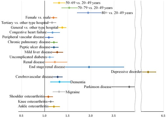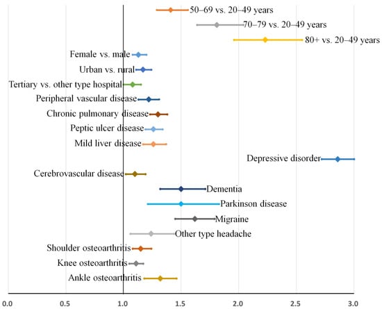 In the main analysis, the relative bias of the estimates for the risk factors was very low at between −4.45 and 2.21%, except for that of cerebrovascular disease (−16%). In the sensitivity analysis, the relative bias of the estimates was also very low between −5.13 and 6.99%. Bootstrap-adjusted odds ratios and 95% confidence intervals for the multivariable model are also displayed in Figure 4 (main analysis) and Figure 5 (sensitivity analysis). Multicollinearity among covariates was low, and all variance inflation factors were less than 1.9.