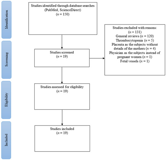 The search identified 150 articles, which after the screening of titles, abstracts, and assessing for eligibility, only 19 studies were included (Figure 1). From the 19 studies, most [8,9,10,11,12,13,14,15,16,17,18,19,20,21,22,23,24,25,26] of them were (n = 5) case series [16,17,18,19,20] and case reports (n = 6) [21,22,23,24,25,26]. Seven studies [8,10,11,12,13,14,15] were performed retrospectively and one [9] was a systematic review. The studies were mostly conducted from 2018 until May 2021. These 19 studies involving 5249 participants included 5128 pregnancies and 121 placentas being examined for TE complications caused by SARS-CoV-2 virus.
