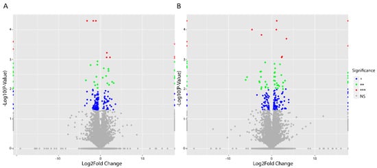 Volcano plots showing differentially regulated genes (DEGs) in SKOV-3 cells treated with 100 nM of asprosin. (A) DEGs 4 h post treatment; (B) DEGs 12 h following treatment. Significance level is recorded as NS (Non-Significant) = grey; * p < 0.05 = blue; ** p < 0.01 = green; *** p < 0.001 = red.