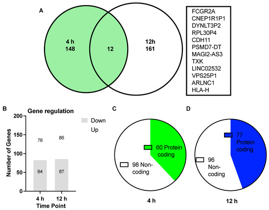 Summary of differentially expressed genes (DEGs) from 4 h (green) and 12 h (blue) data sets, comparing SKOV-3 cells treated with 100 nM of asprosin with non-supplemented controls. (A) Venn diagram depicting the number of unique DEGs at 4 h (148) and 12 h (161) with 12 common genes between the overlapping time points annotated to the right of the diagram; (B) Bar graph showing the number of up regulated and down regulated DEGs at each time point; (C,D) Quantification of coding and non-coding genes for each time point: (C) 60 protein coding, with 98 non-coding at 4 h; (D) 77 protein coding and 96 non-coding at 12 h.