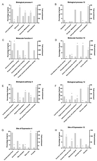Functional enrichment of differentially expressed genes (DEGs) matched with Funrich data base. (A,C,E,G) indicate altered process 4 h after treatment with 100 nM asprosin; (B,D,F,H) show processes associated with DEGs 12 h after treatment. (A,B) Biological process; (C,D) Molecular function; (E,F) Biological Pathway; (G,H) Site of expression. Significant data sets identified using hypo geometric test are indicated by * p < 0.05.