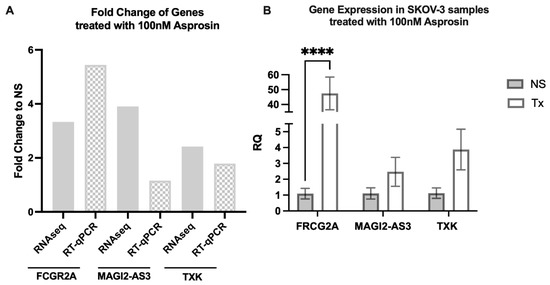 Genes that were commonly expressed at both 4 and 12 h were chosen for analysis, in addition to their association with cancer in the literature [33,34,35]. FCGR2A, MAGI2-AS3 and TXK were up-regulated on initial treatment with asprosin and show a similar increase in expression upon repeat and validation with RT-qPCR, albeit to a lesser effect than seen in RNA sequencing (Figure 6).
