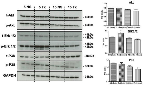 Western blots showing the total and phosphorylated proteins Akt, ERK 1/2, P38, and the loading control GAPDH following treatment with 100 nM of asprosin terminated at 5 and 15 min; followed by densitometric analysis. OD: Optical density, ** p < 0.01.