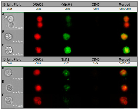 Cancer-associated circulating cells (CCs) from liquid blood biopsies donated by six different serous OvCa patients probed with OR4M1/TLR4. (A–C) Samples showing the expression of OR4M1 (Ch02—green) in the circulating tumour cells of patients presenting with high grade serous ovarian cancer; (A) represents stage IV, (B) stage IV and (C) stage III; (D–F) Expression of TLR4 in CCs; here, Ch02 represents TLR4 (green); (D) is representative of stage II, (E) stage III and (F) stage IV. Ch01, Bright Field; Ch02, OR4M1/TLR4 (green); Ch04, CD45—white blood cell exclusion marker (brown); Ch05, DRAQ5—cell nuclear stain (red); Ch02/05, overlay of Ch02 with Ch05. Stages (I–IV) refer to the severity of OvCa metastasis according to the International Federation of Gynaecology and Obstetrics (FIGO) staging system.