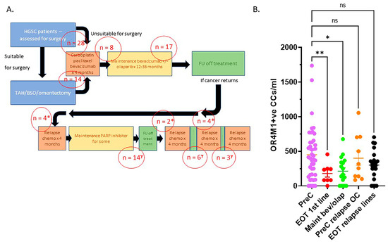 Panel (A): Schema of the recruitment of patients. FU: follow up, TAH/BSO: abdominal hysterectomy and bilateral salpingo-oophorectomy. Panel (B): OR4M1 + ve circulating cells decrease with chemotherapeutic treatment; 100 patients, representative of patients presenting with high grade serous ovarian cancer (HGSC) stages: I–IV: Pre-chemo (PreC, n = 42), end of first line chemotherapy (EOT 1st line, n = 8), maintenance bevacizumab +/− olaparib (maint bev/olap, n = 17), pre-chemo for relapse OC (PreC relapse OC, n = 10), end of chemo for relapse OC (EOT relapse lines, n = 23). (Error bars: SEM; significance determined using ANOVA, * p = 0.012, ** p = 0.0069). CCs: cancer-associated circulating cells.