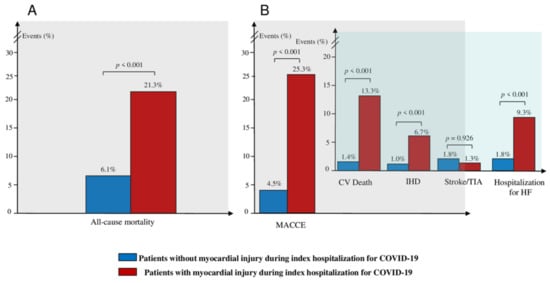 Clinical outcome according to the presence or absence of myocardial injury during the index hospitalization: (A) Incidence of composite of all-cause mortality at follow-up, according to the presence or absence of myocardial injury during the index hospitalization for COVID-19. (B) Incidence of composite of MACCE and individual components of MACCE at follow-up, according to the presence or absence of myocardial injury during the index hospitalization for COVID-19. Abbreviations: MACCE—major adverse cardiovascular and cerebrovascular event; CV—cardiovascular; IHD—ischemic heart disease; TIA—transient ischemic attack; HF—heart failure; COVID-19—Coronavirus Disease-2019.