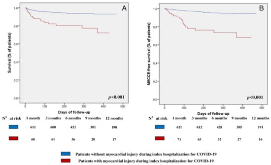 Survival analysis: (A) Survival Kaplan–Meier curve for all-cause mortality, according to the presence or absence of myocardial injury during the index hospitalization for COVID-19. (B) Survival Kaplan–Meier curve for MACCE, according to the presence or absence of myocardial injury during the index hospitalization for COVID-19. Abbreviations: MACCE—major adverse cardiovascular and cerebrovascular event; COVID-19—Coronavirus Disease-2019.