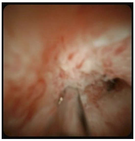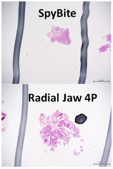 One study showed that the diagnostic sensitivity of POCS-guided biopsy was significantly better than that of fluoroscopy-guided biopsy [20]. However, two subsequent studies failed to demonstrate the superiority of POCS-guided biopsy [21,22]. In addition, a meta-analysis reported that the pooled sensitivity of POCS-guided biopsy for malignant biliary strictures was 60.1% (95% CI, 54.9–65.2) [23], which is relatively low. Our early experiences using the POCS-guided targeted biopsy often showed failed diagnostic results and using the fluoroscopy-guided biopsy sometimes provided better results. Therefore, we performed both the fluoroscopy-guided biopsy and the POCS-guided biopsy in routine practice. In the present study, we aimed to elucidate the real benefit of using the POCS-guided biopsy. The diagnostic sensitivity of POCS-guided biopsy was compared with that of fluoroscopy-guided biopsy in patients with suspected bile duct cancer. We found that the diagnostic sensitivity of POCS-guided biopsy was lower than that of fluoroscopy-guided biopsy (54.0% and 64.0%, respectively), although the difference was not statistically significant. The reason for this low sensitivity is likely the limited volume and quality of the biopsy samples. Only mini-cup biopsy forceps can be used during POCS, and these forceps can only obtain small biopsy specimens. Indeed, according to our measurement of the histopathological specimens, the mean size of the POCS-guided biopsy samples was approximately half that of the fluoroscopy-guided biopsy samples. Additionally, the quality of the histopathological samples from the POCS-guided biopsies was significantly poorer than the samples from the fluoroscopy-guided biopsies. The POCS has only a small working channel (1.2 mm diameter), and the dedicated biopsy forceps are much smaller than conventional biopsy forceps (Figure 3). Larger biopsy forceps can sample wider and deeper areas in the bile duct wall (Figure 4).
