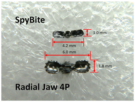 Following the POCS-guided targeted biopsy, the cholangioscope was withdrawn from the duodenoscope, and the fluoroscopy-guided transpapillary tissue sampling was performed using conventional biopsy forceps (Radial Jaw 4P; Boston Scientific Inc., Natick, MA, USA) through the working channel of the duodenoscope (Figure 2). The cup sizes of the biopsy forceps are shown in Figure 3. Each biopsy from a bile duct stricture suspected of biliary malignancy was performed a minimum of two times. However, the actual number of biopsy samples obtained was determined by the endoscopist based on the macroscopic volume of the biopsy sample and the patient’s condition.