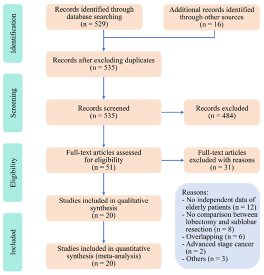 The inclusion criteria were as follows: (1) study population: elderly NSCLC patients (≥65 years) with stage I NSCLC (the eighth version of the TNM system was preferred to the seventh and sixth versions of the TNM system); (2) comparison: segmentectomy, wedge resection, or sublobar resection vs. lobectomy; (3) endpoints: perioperative morbidities, recurrence patterns, or survival outcomes; and (4) study type: prospective or retrospective cohort studies and database studies. The exclusion criteria included: (1) the lack of independent data of elderly patients; (2) the lack of comparison between sublobar resections and lobectomy; (3) the inclusion of advanced NSCLC; (4) reviews, case reports, comments, editorials, or corresponding letters; (5) overlapping studies; and (6) non-English literature. Two authors (P.W. and Z.L.) independently reviewed the titles and abstracts to screen possibly eligible articles. The full text was then independently reviewed for final validation. During these processes, any disagreement was resolved by the adversary group.