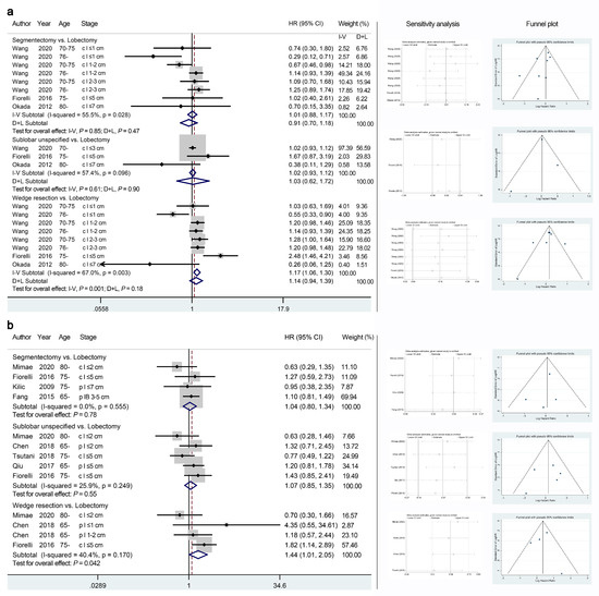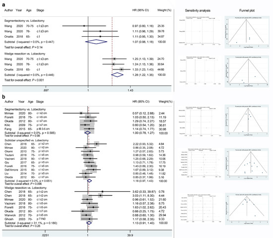 Meta-analyses comparing the overall survival outcomes of sublobar resections with those of lobectomy using database studies (a) or cohort studies (b). The right panel presents the outcomes of sensitivity analyses and the funnel plots corresponding to the forest plots shown in the left panel. HR, hazard ratio; CI, confidence interval.