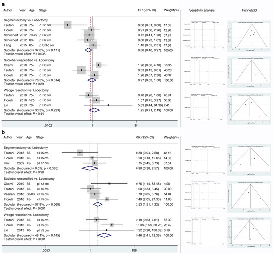 Meta-analyses comparing the overall recurrence risk (a) and local recurrence risk (b) of sublobar resections with those of lobectomy. The right panel presents the outcomes of sensitivity analyses and the funnel plots corresponding to the forest plots shown in the left panel. OR, odds ratio; CI, confidence interval.