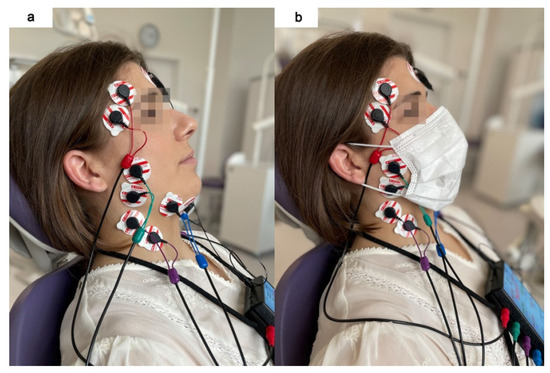 Electromyographic examination during two conditions: without (a) and with medical mask (b).
