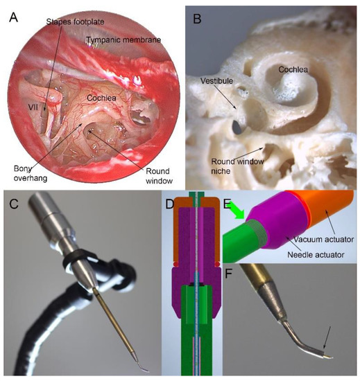 Microneedles can also be used for sampling. There are multiple types, most of which have been developed and optimized in animal models. To collect perilymph, the needle is advanced into the RWM and perilymph is drawn up using a syringe. Multiple studies have shown that perforation of the RWM with microneedles does not affect hearing threshold in animals and are generally atraumatic [79,80,81,82]. Microneedles have not yet been tested in humans intraoperatively; however Early et al. recently tested a novel microneedle in fresh frozen human temporal bones. They found that the microneedle with syringe could reliably withdraw 5 µL of perilymph from the scala tympani with minimal contamination and little trauma to the RWM [83]. Although microneedles have a more complex design than the glass capillary tubes, they allow for controlled aspiration of perilymph. This may result in more consistent volumes sampled and may decrease the likelihood of CSF contamination. Using the approach to the round window outlined above and a curved sampling device, articulated instruments that allow incremental advancement of a needle through the round window and subsequent microfluidic withdrawal of 10 µL of perilymph could also be designed (Figure 1C–F).