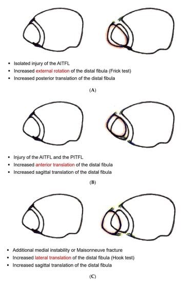 The next step after direct fixation of the posterior malleolus, or the first step in case of an intact posterior malleolus, is direct visualization of the AITFL and an intraoperative grading of the injury pattern under direct view (Figure 2). The surgeon should be aware that only grade 3 injuries would be detected by the well-known Cotton test or its hook test modifications [22,90,101,103]. Increased external rotation and posterior sagittal translation indicates an isolated tear or bony avulsion of the AITFL, representing a grade 1 injury (Figure 2A); increased anterior sagittal translation indicates an additional tear or bony avulsion of the PITFL, representing a grade 2 injury (Figure 2B); and increased lateral translation indicates additional medial instability, representing a grade 3 injury (Figure 2C). Further treatment strategy should be according to the detected individual injury pattern: