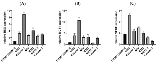 Additionally, we assessed the mRNA expression of MCT1 and VEGF, the two proteins associated with BSG function in cancer. MCT1 expression was higher in all AML lines excluding MUTZ-3 (p < 0.010), which had slightly lower MCT1 expression compared to normal CD34+ cells (0.70 relative to normal CD34+ cells; Figure 1B). As with BSG, Kasumi-1 was characterized by the highest level of MCT1 expression (10.76 relative to CD34+ cells), while the median expression level of all AML lines (including MUTZ-3) was 3.36. Unlike MCT1 and BSG, relative VEGF expression was not uniform among AML lines, although most AML lines had expression levels higher than or similar to normal CD34+ cells (Figure 1C). The highest expression was observed in U937 cells (2.63 relative to normal CD34+ cells). Two lines (Kasumi-1, NB4) had expression slightly higher than normal CD34+ cells. One was not significantly different from the control (HT93), while two lines (Kasumi-3 and MUTZ-3) had lower expression than the control.
