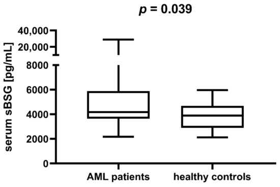 Having proven the increased expression of BSG in AML, we attempted to analyse the expression of soluble BSG (sBSG) in the serum of AML patients (n = 37) and healthy individuals (n = 25). The median and interquartile range were 4186.45 pg/mL (IQR = 3658.70–5710.65) for the former and 3894.45 pg/mL (IQR = 2903.50–4544.15) for the latter group. Comparing sBSG levels in the two groups, we found that sBSG was higher in the serum of AML patients compared to healthy individuals (p = 0.039, Figure 2). Additionally, we performed an age- and sex-adjusted logistical regression analysis that included the level of sBSG as a potential factor differentiating cases from controls. This analysis seems to confirm the trend of higher sBSG in AML patients (p = 0.077). This indicates that serum sBSG may be a potential marker of AML.