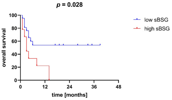 For further analyses, we divided our cohort of AML patients into two groups according to their sBSG level—those with high sBSG (values above the upper quartile, or 5710.65 pg/mL) and those with low sBSG (values below the upper quartile). Using the Kaplan–Meier method, we found that patients in the high sBSG group had significantly worse overall survival (OS) than patients in the low sBSG group (p = 0.028; Figure 3).