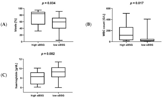 Percentage of blasts in the bone marrow (A), white blood cell (WBC) count (B), and haemoglobin levels (C) in AML patients with high and low sBSG. Patients with high sBSG were characterized by a higher percentage of blasts, higher WBC count, and lower haemoglobin levels, although the latter association was not statistically significant. Increased percentage of blasts, increased WBC count, and decreased haemoglobin are all hallmarks of more advanced AML. The cut-off for high sBSG was the upper quartile among the studied patients, or 5710.65 pg/mL.