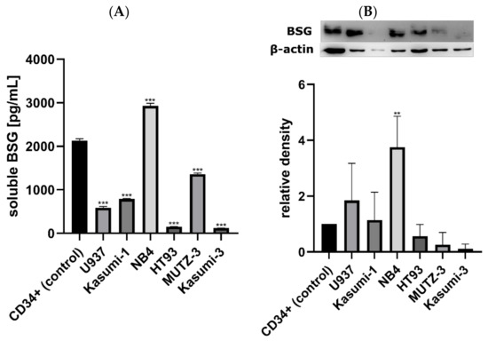 Protein expression of BSG in AML cell lines and normal CD34+ cells. (A) shows secreted soluble BSG in cell culture supernatants, while (B) shows the total BSG levels in cell lysates of AML cell lines and normal CD34+ cells normalized to β-actin. Protein expression of BSG in relation to normal CD34+ cells differs between various AML lines and is not consistent, although most cell lines exhibit lower soluble BSG levels than the control (A), and total BSG levels higher than or similar to the control (B). Each bar represents results from three technical repeats, and representative immunoblots for BSG and β-actin are shown above the plot (B). The significance of the differences between individual lines and the normal CD34+ cells is indicated as: p < 0.050, ** p < 0.010, *** p < 0.001.