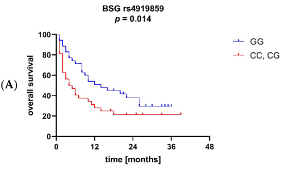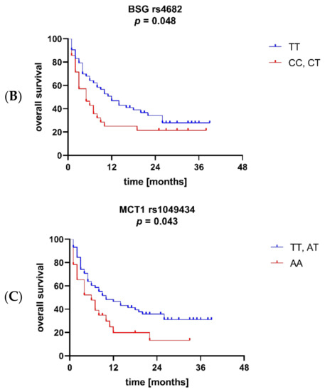 The Kaplan–Meier method was used to assess the effects of BSG and MCT1 SNPs on overall survival. The analysis showed that BSG alleles rs4919859 C and rs4682 C were associated with significantly worse OS (p = 0.014 and p = 0.048, respectively; Figure 6A and 6B), while carriers of MCT1 allele rs1049434 T were characterized by better OS (p = 0.043; Figure 6C). Additionally, a trend towards better OS in patients with MCT1 allele rs9429505 A was observed (p = 0.063). No association between the SNPs and soluble BSG levels was found in AML patients.