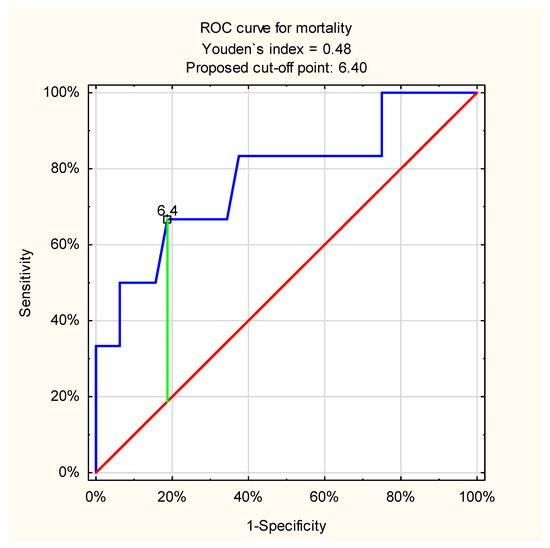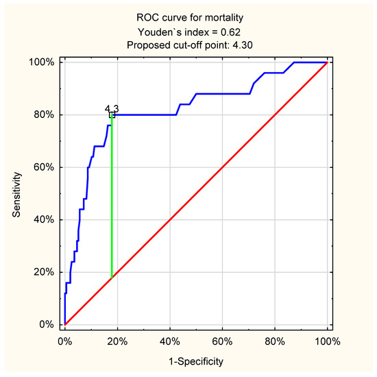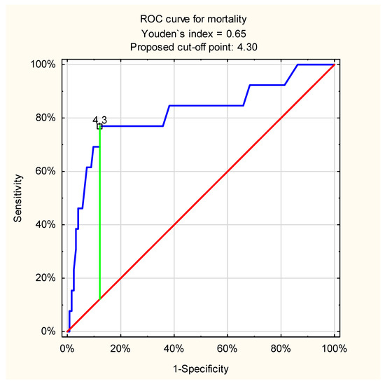The most frequent cause of the UGIB was bleeding peptic ulcer. ROC curve analysis also showed excellent discriminatory ability of admission venous lactate level and in-hospital mortality in this etiologically homogeneous and important patient subgroup: proposed cut-off point = 4.3 mmol/L, AUC = 0.82 (95%CI: 0.67–0.96, p < 0.001) (Figure 4).