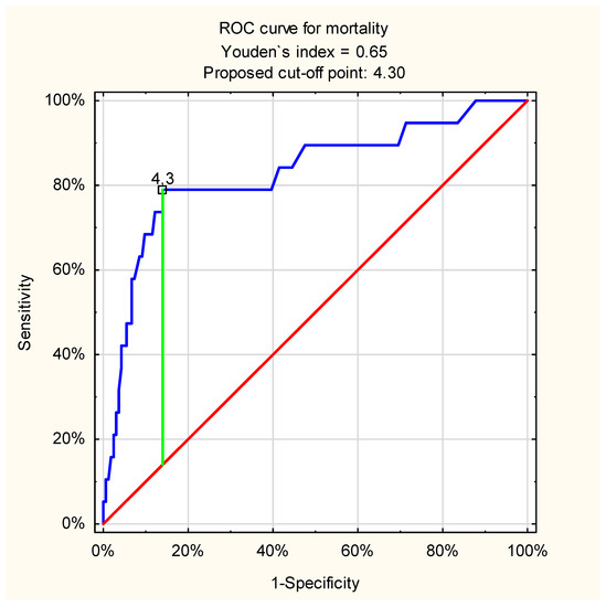 In turn, ROC curve analysis indicated an excellent value of this parameter in predicting mortality in patients with non-variceal UGIB: cut-off point = 4.3 mmol/L, AUC = 0.83 (95%CI: 0.72–0.94, p < 0.001) (Figure 3).