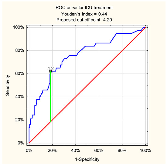 The logistic regression models showed that there was a statistically significant association between admission venous lactate level and need for intensive care unit treatment, OR = 1.33 (95%CI: 1.19–1.50, p < 0.001). That means that a 1 mmol/L increase of admission lactate level was associated with 33% increased odds of intensive care unit therapy in patients with UGIB. ROC curve analysis in case of intensive care need in all patients with UGIB showed acceptable discriminatory ability of the test: cut-off point = 4.2 mmol/L; AUC= 0.76 (95%CI: 0.66–0.85, p < 0.001) (Figure 5).