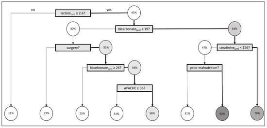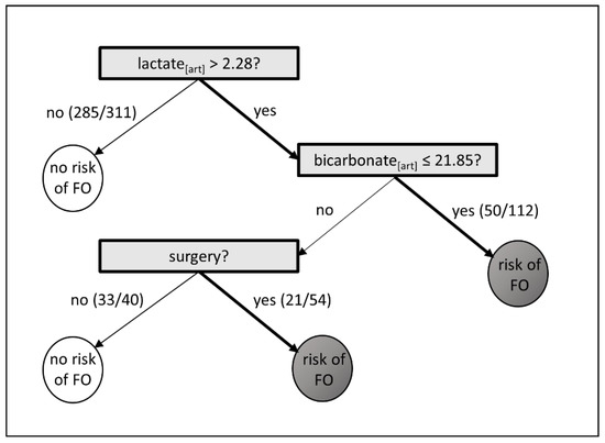 The fast and frugal tree (FFT) analyses in 517 patients determined a pathway starting with baseline lactate, followed by surgery prior to admission and baseline bicarbonate levels. Lactate levels > 2.28 mmol/L, bicarbonate levels ≤ 21.85 mmol/L, and surgery prior to ICU admission correctly decided for FO in 68% (71/104) patients, and for no FO in 76% (318/413), see Figure 2. Overall, the sensitivity was 68.3% and specificity 77.0%.