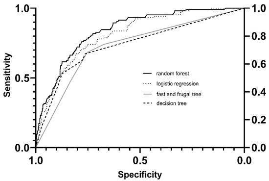 Comparing the random forest model, the fast and frugal tree, the classification decision tree, and the logistic regression (see Figure 4), the best AUC for predicting FO on day three in critically ill patients was the random forest model with 0.84 (95% CI 0.79–0.86). The logistic regression had an AUC of 0.81 (95% CI 0.77–0.86), followed by an FFT of 0.74 (95% CI 0.69–0.79), and a DT AUC of 0.73 (95% CI 0.68–0.78). While the AUC of the logistic regression and the random forest model did not differ significantly (p < 0.251), the AUC of the fast frugal trees and the classification decision tree was significantly lower than that of the logistic regression model and the random forest model (all p < 0.0001). The AUC of the FFT and the DT did not differ significantly (p < 0.72).