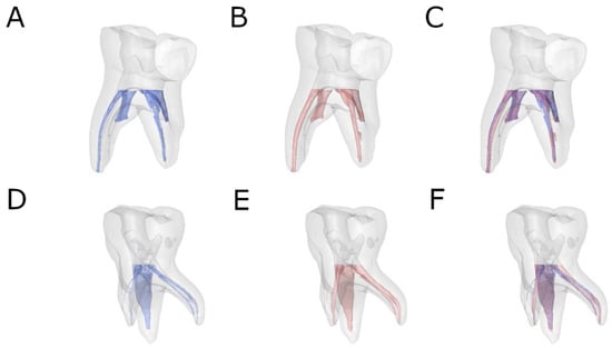 Preoperative and postoperative micro-CT scans (Micro-CAT II, Siemens Preclinical Solutions, Knoxville, TN, USA) were performed to analyze and compare the amount of root canal dentin removed by the Endogal Kids and Reciproc Blue NiTi endodontic reciprocating systems subsequent to the root canal treatment of the primary second molar teeth. The scans were taken using the following exposure parameters: 88 µA, 90 kV, 360° rotation, and 50 μm isotropic resolution. Tomographic 3D images of the entire tooth showed a total of 512 slices, with an isotropic voxel size of 50 microns and a 512 × 512-pixel resolution for each slice (Figure 1A–F).
