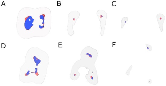 Transverse section images after aligning preoperative (blue) and postoperative (red) micro-CT scans of the EDG study group at the (A) coronal, (B) middle, and (C) apical root third and (D) coronal, (E) middle, and (F) apical root third of the RB study group.
