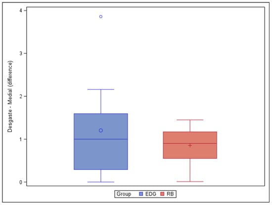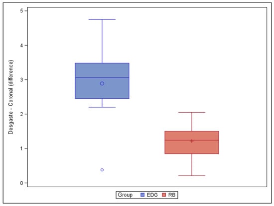 Box plot of the difference in dentin volume pre- and post-root canal procedure between the EDG and RB study groups at the coronal level.