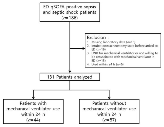 From September 2019 to April 2020, adult patients (age ≥ 18 years) that were qSOFA-positive upon ED arrival and were diagnosed with sepsis were included. Patients who were under 18 years old, pregnant, arrived in cardiac arrest, had missing laboratory results needed to calculate the SOFA score or ROX index, had a do-not-resuscitate (DNR) order for mechanical ventilator or were not willing to be resuscitated with mechanical ventilator, or were in an intubated state or tracheostomy state before arrival to the ED were excluded. Patients who did not survive for more than 24 h were excluded as this might have affected the primary outcome.