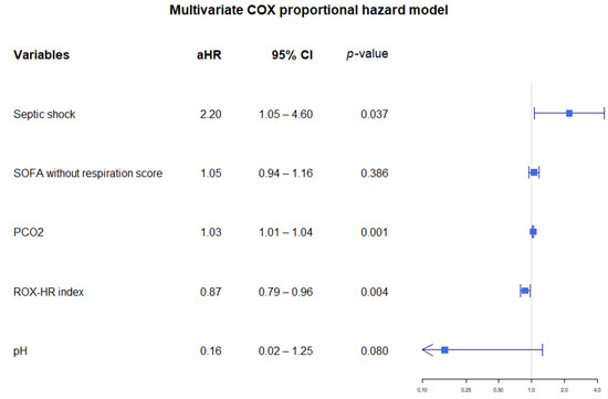 Multivariate cox proportional hazard model using the ROX-HR index. Abbreviations: aHR = adjusted hazard ratio, CI = confidence interval, SOFA = sequential organ failure assessment, PCO2 = partial pressure of carbon dioxide.