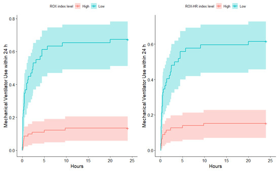 Kaplan–Meier curve for mechanical ventilator use within 24 h by ROX index (left) and ROX-HR index (right) level.