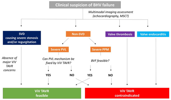 According to the Valve Academic Research Consortium (VARC)-3 criteria, four main mechanisms of BHV failure have been identified: SVD, non-SVD, valve thrombosis, and valve endocarditis [22]. SVD is defined as intrinsic permanent changes in BHV, including wear and tear, leaflet disruption, flail leaflet, leaflet fibrosis, and/or calcification and strut fracture, resulting in stenosis and/or regurgitation. Indeed, non-SVD encompasses paravalvular leak (PVL) and PPM. A scale of SVD has been proposed by the European Association of Percutaneous Cardiovascular Interventions endorsed by the European Society of Cardiology (ESC) and the European Association for Cardio-Thoracic Surgery [23] (Table 3). The precise diagnosis of the failure mechanism is of utmost importance to plan the proper treatment. In fact, if patients affected from SVD are suitable for ViV TAVR, in most of the non-SVD cases trans-catheter correction is not indicated and is counterproductive. If PVL is the failure mode, understanding the underlying mechanism is pivotal to predicting the ViV usefulness [24]. A practical diagnostic and therapeutic algorithm is shown in Figure 2. In general, bovine pericardial BHV is more prone to stenosis, whereas porcine leaflets tend to fail more commonly by regurgitation [6]. If THVs and surgical BHVs have similar long-term durability is still an open issue. THV leaflets are thinner, subjected to higher stresses and strain, and require crimping [25]. Despite these aspects can predict a faster deterioration, THVs have less PPM and larger mean areas. Taken together, current data show that THVs perform at least similarly to surgical BHV at five to six years. Inevitably, the occurrence of PVL is still considered the main issue related to the use of THVs than surgical replacement [26].