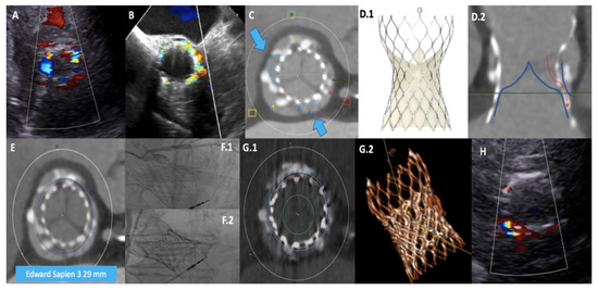 Multimodal imaging approach to assess the feasibility of ViV TAVR for PVL correction. A patient, with previous Evolut R 34 mm (Medtronic) implantation, presented with severe paravalvular leak (PVL) at transthoracic (A) and transesophageal (B) echocardiography, due to low device implantation. Multi-slice computed tomography (MSCT) confirmed the PVL mechanism, showing incomplete native annulus sealing by the narrow part of the trans-catheter (THV) waist (in (C) blue arrows indicate the two gaps); moreover, also the internal THV skirt was too low and unable to properly work (D.1,D.2). MSCT allowed a simulation of ViV TAVR using a balloon-expandable Sapien 3 29 mm (Edwards, blue circle in (E)), able to stretch the self-expanding device frame in order to correctly seal the native annulus. Angiographic evidence of pre-ViV TAVR PVL with confirmation of previous low THV implantation (F.1) and final result (F.2). Post-procedural MSCT showed a proper PVL mechanism correction (G.1,G.2), with only mild residual PVL at pre-discharge echocardiographic assessment (H). TAVR: trans-catheter aortic valve replacement; ViV: valve-in-valve.