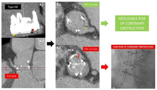 Prediction of coronary artery obstruction. A 60-year-old lady presented with Carpentier-Edwards Perimount BHV degeneration. The BHV frame extends above the coronary ostia, but below the sinotubular junction (A.1,A.2), showing RCA distance from the annulus of 3.9 mm). This situation is potentially at increased coronary obstruction risk. In this case, the following step is to calculate the VTC distance, intended as the distance between the prosthetic frame and coronary ostia: for the LCA the VTC is 5.4 mm (B.1) whereas a shorter VTC is depicted for the RCA (B.2). Considering a cut-off value of 4 mm, the patient is judged at negligible risk of LCA occlusion during ViV TAVR but at increased risk for RCA occlusion. For this reason, prophylactic RCA wiring and stenting are performed during ViV TAVR (C).