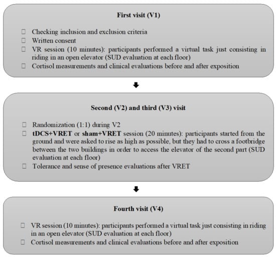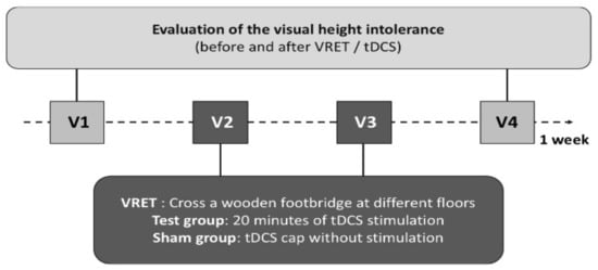- Two exposure sessions (V2 and V3), during which participants were exposed to height (VRET) for 20 min while being stimulated online (active tDCS) or not (sham tDCS). Two sessions is the minimal number of sessions needed to observe VRET efficacy in the literature. We chose that number since the aim of research regarding potentiating the VRET effect with other interventions is to achieve a stronger and quicker effect [].